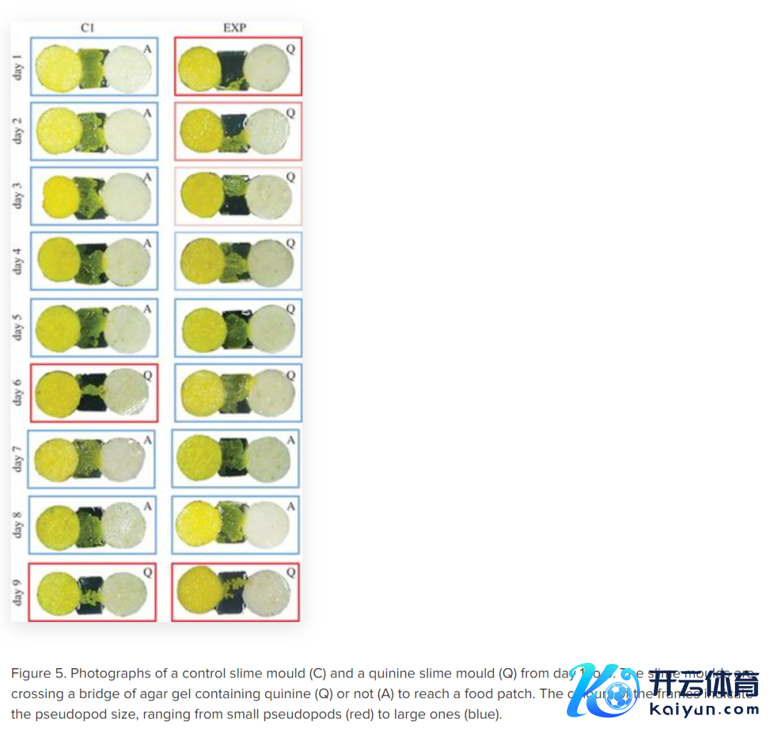 △ 两组黏菌在进步含有奎宁的琼脂桥和不含奎宁的琼脂桥时的行动响应。图中的黏菌辞别为对照组(C)和推行组(EXP)