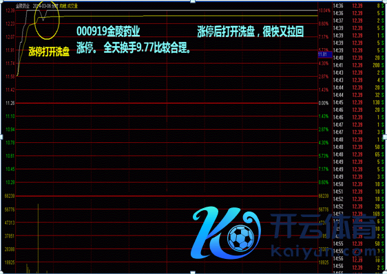 下图:000919 金陵药业当天快速拉到涨停后强势洗盘!但是全天换手率不到10%,之后又可以拉回涨停板全天!