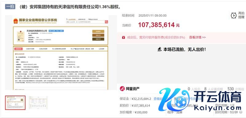 新京报贝壳财经讯(记者徐雨婷)1月11日,阿里钞票拍卖齐集平台败露,天津信赖有限包袱公司(以下简称“天津信赖”)1.36%股权已流拍,该笔股权所属安邦保障集团股份有限公司(以下简称“安邦集团”),起拍价1.07亿元,于1月10日开拍。