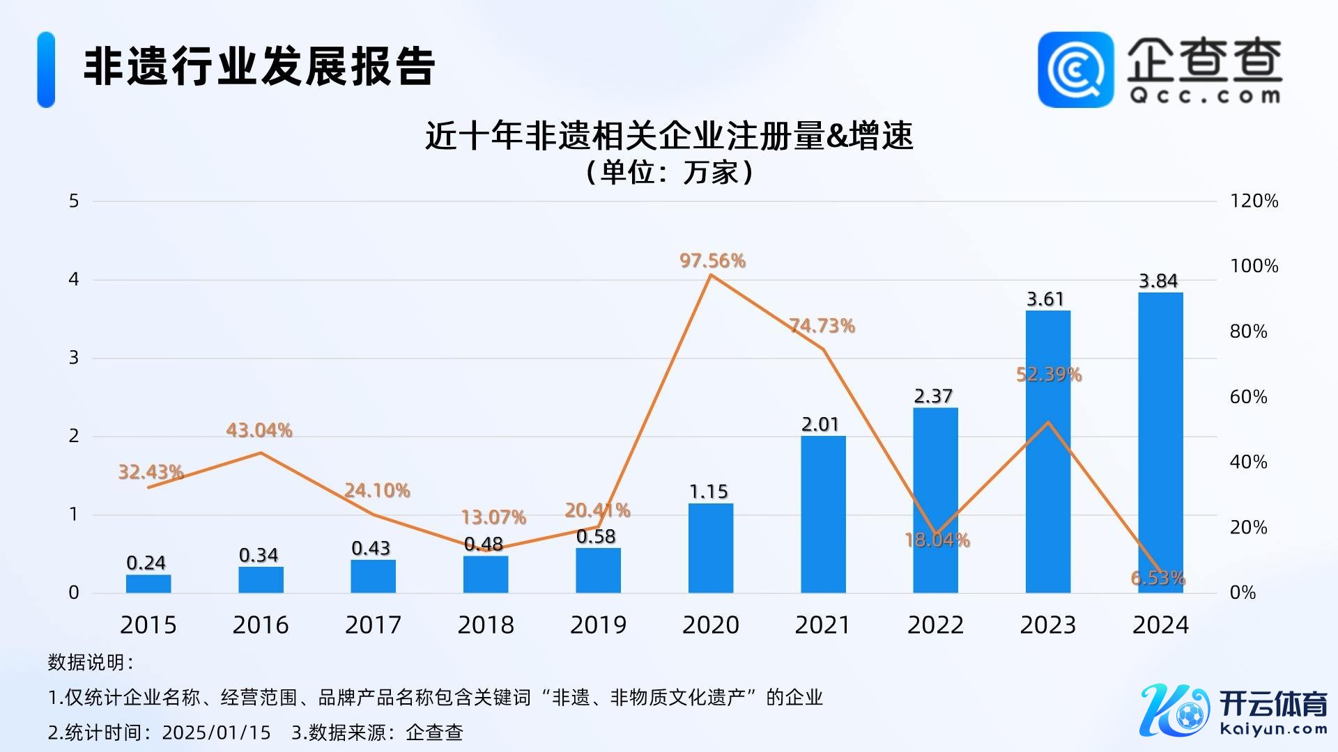 企查查数据泄露,国内现有非遗关联企业13.88万家。近十年关联企业注册量握续增长,自2015年全年注册0.24万家一都攀升,至2024年全年注册3.84万家。其中,作陪连年非遗文化传承愈发被喜爱,2020年全年注册量猛增97.56%至1.15万家,达近十年注册量增速峰值。法规当今,2025年仅15天已注册0.12万家非遗关联企业。