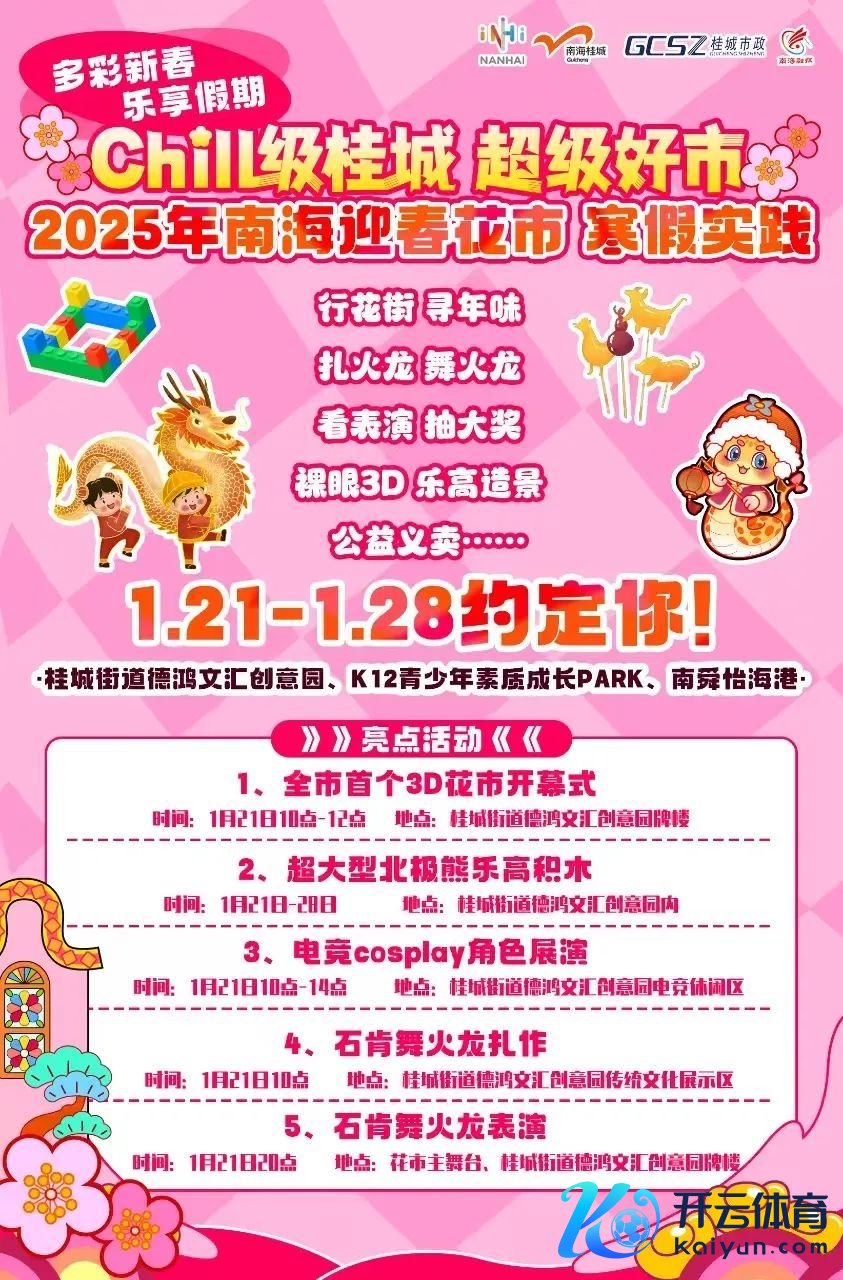 行花街、寻年味、扎火龙、舞火龙、看饰演、抽大奖,还有裸眼3D、乐高造景、公益义卖……如斯丰富多彩的寒假扩张行为,通通都能在“chill级桂城 超等好市”2025年南海迎春花市上得志孩子。